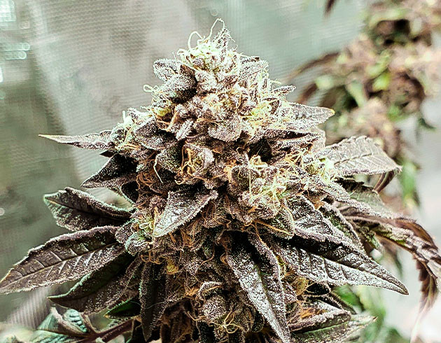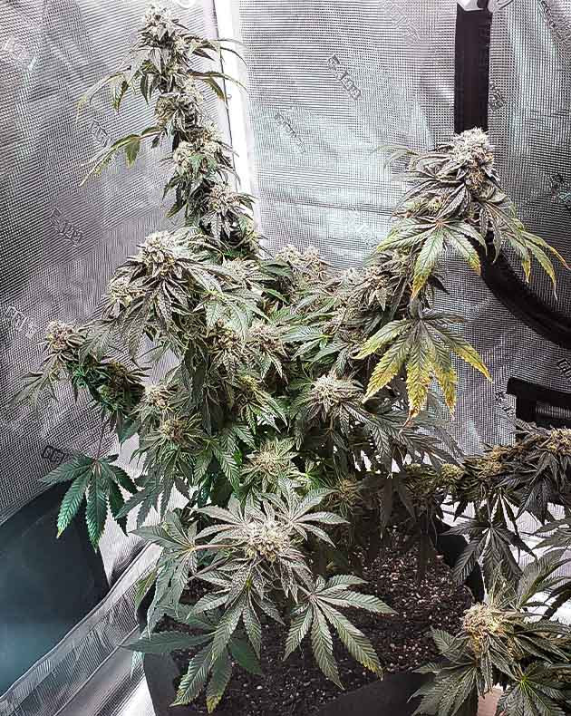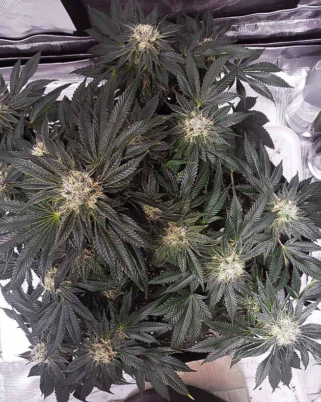 Если на шестой неделе фиолетовый цвет только начинал пробиваться сквозь яркую зелень, то уже к концу седьмой растения с ног до головы поблескивали пурпурным отливом. Скорее всего, из-за неравномерного роста двух кустов начали гореть листья на том, который более высокий. Во всяком случае откровенная желтизна появилась только на листьях верхних кол именно этого растения. Нижняя листва и второй куст выглядели неплохо. Да это и не странно. С учетом такой высокой температуры и мощного светового потока немудрено было сгореть. Я чуточку поднял светильник, но сильно задирать не стал, чтобы и второму «коротышу» доставалось достаточно света для набора массы бутонов. С этим, кстати, проблем особых не было. Смола, будто хрустящие кристаллики сахара, покрывала все, включая листья и стебли.