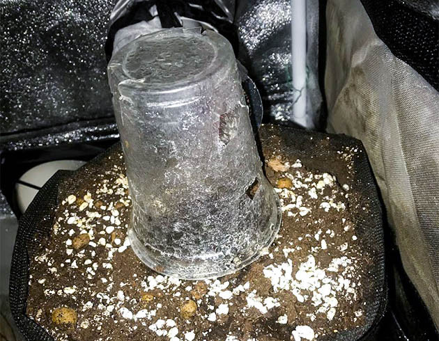 Через 6-12 часов (примерно), когда семечка проклюнулась, у нас уже грунт готов, и он немного влажный. Готовлю лунку глубиной, как одна фаланга пальца (3 см), кладу в нее семечку аккуратно корешком либо вниз, либо вбок. Не вдавливаю проросток в почву, а как бы немного присыпаю лунку грунтом. После этого включил вытяжку, свет 18/6, кулеры (вентиляторы). И самое важное – поставил пластиковый прозрачный стаканчик с маленькими отверстиями, предварительно его увлажнив изнутри пшикалкой с отстоянной водой.