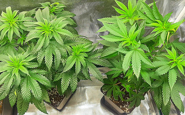 В начале шестой недели сделал топпинг на обоих кустах. После топпинга полил с BioEnhancer 0,4 мл/л при поливе 400 мл. После восстановления роста от топпинга стала заметна незначительная разница фенотипов, но так даже лучше. Стараюсь не заливать кустики, лью по 2-3 раза в неделю в зависимости от просыхания почвы. В целом никаких проблем, во многом за счет стабильности условий, умеренной подкормки и полива.