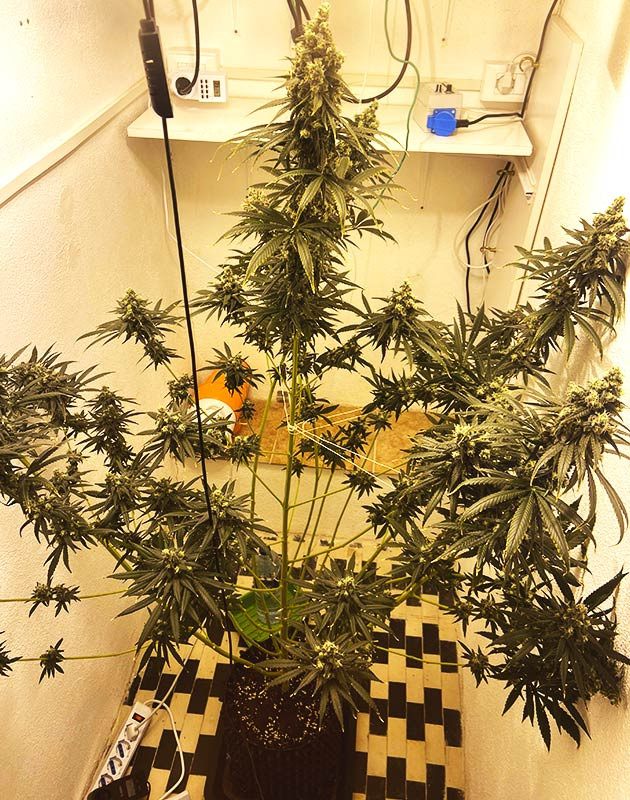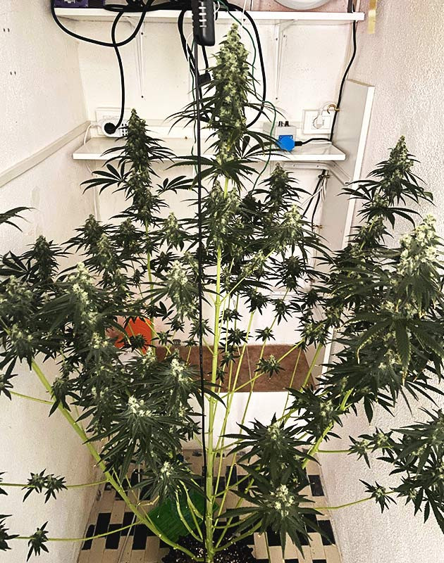 Следующая пара недель прошла гладко и без сюрпризов. Куст перестал вытягиваться и направил всю свою неугомонную силу на формирование бутонов. Соцветия на глазах увеличиваются в размерах и уже покрыты слоем липких трихом. Я продолжаю срезать ненужные листья, а после работы, даже вымыв руки с мылом, от кожи исходит насыщенный аромат смолы. В комнате, где находится куст, также достаточно сильный запах, который очень напоминает аромат газа.