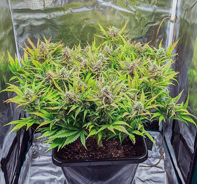 К концу девятой недели растишка перестала тянуться, и я решил снять сетку. Высота кроны составляла где-то 45 сантиметров. Куст продолжает много пить, но уже не в таком количестве, как во время первых недель цветения. Сахарная листва начала постепенно менять цвет. Много верхних листиков пострадало от светового ожога. Таким образом, на верхушках получилась разноцветная палитра из жёлто-коричнево-фиолетовых листьев. Волоски на шишках начали менять окрас на десятой неделе, но при осмотре трихом янтаря я пока не заметил.