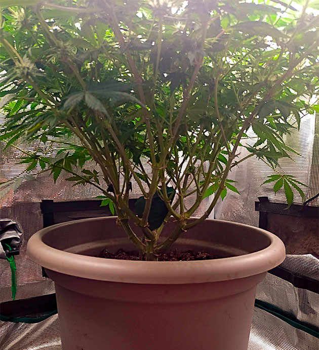 Заключительная неделя вегетации. Кустик отлично разросся, но ему еще предстоит заполнить всю сетку. Удалил небольшое количество слишком большой листвы, также подрезал еще несколько паростков, которые пытаются пробиться на нижних ярусах под сеткой. Также обработал листву спреем от насекомых в качестве превентивной меры. Растиха получила одну порцию компота и после два полива чистой водой. В конце недели переключил свет на 12/12, борд работает на 100 % мощности.