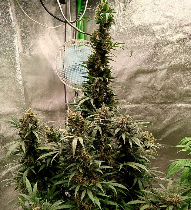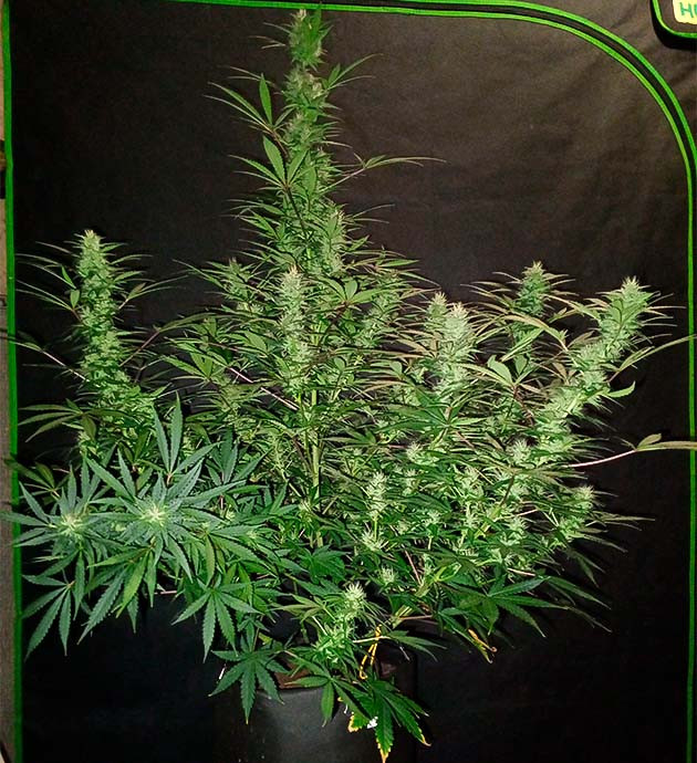 В течение нескольких недель соцветия полноценно сформировались и начали покрываться янтарными трихомами. Я провел еще одну, на этот раз последнюю дефолиацию. Запах стал гораздо сильнее, поэтому пришлось прибегнуть к поддержке угольного фильтра. Световой режим – 20/4, уровень влажности – 30-40 %, а температура – 22-25 градусов. Следующая неделя, скорее всего, станет последней.
