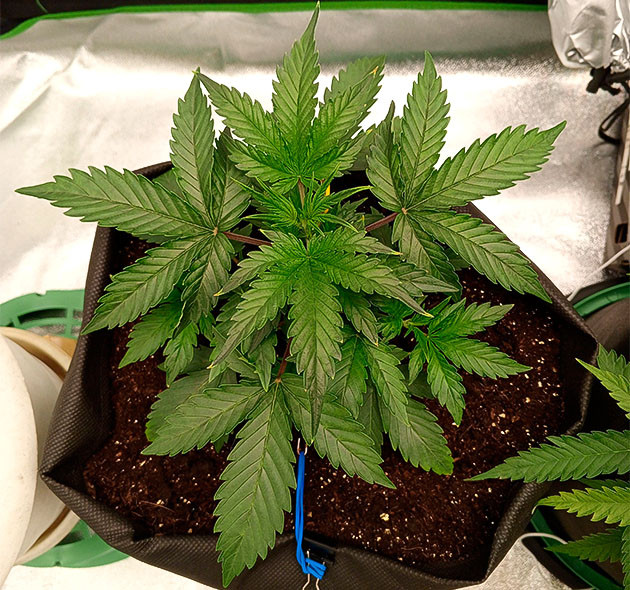 Четвертая неделя ознаменовалась пересадкой в тканевый горшок на все те же 26 литров. Решил поменять контейнер по личным соображениям. На пятой неделе растишка благополучно зацвела, а значит, пересадка прошла успешно. Пока она особо не развивается, но я в нее верю. Температура колеблется в районе 26-29 градусов, влажность держится на 50 %, а до лампы теперь 70 сантиметров.