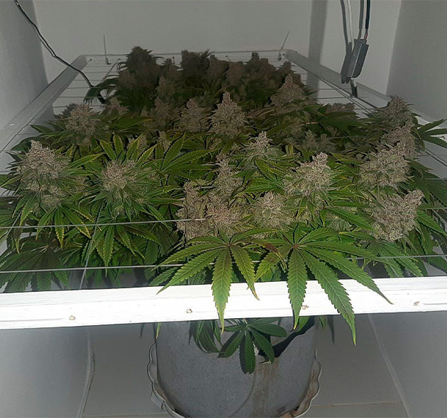 После последних фотографий у девчонки начались 152-е сутки жизни (83-и на 12/12). Перед пробуждением я приехал и отключил лампы, а также убавил температуру в боксе до 17-18 °C. Получается 153/84 она просидела в темноте и прохладе, а в возрасте 154 дней/суток от каски, 85 дней из которых был режим цветения, я её зарэзал.