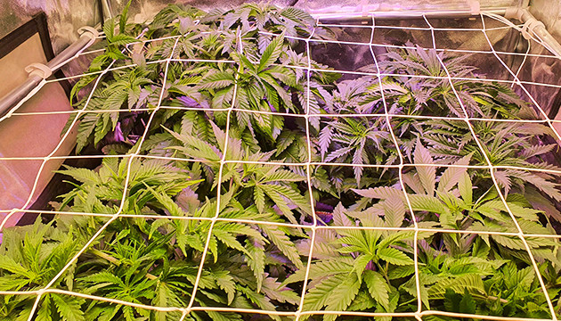 В начале пятой недели я сделал топпинг, немного согнул кустики и натянул сетку ScrOG. Очень доволен тем, какая получилась крона. Причем растихи стоят плотно друг к другу, прилично разрослись в ширину, и поэтому крона получилась практически однородной. Растения быстро восстановились от топпинга и продолжили расти. До сетки оставалось всего несколько сантиметров. Несмотря на то, что цветение еще не началось, в боксе уже появился запах.
