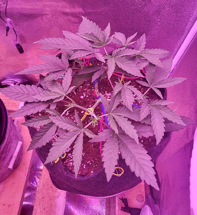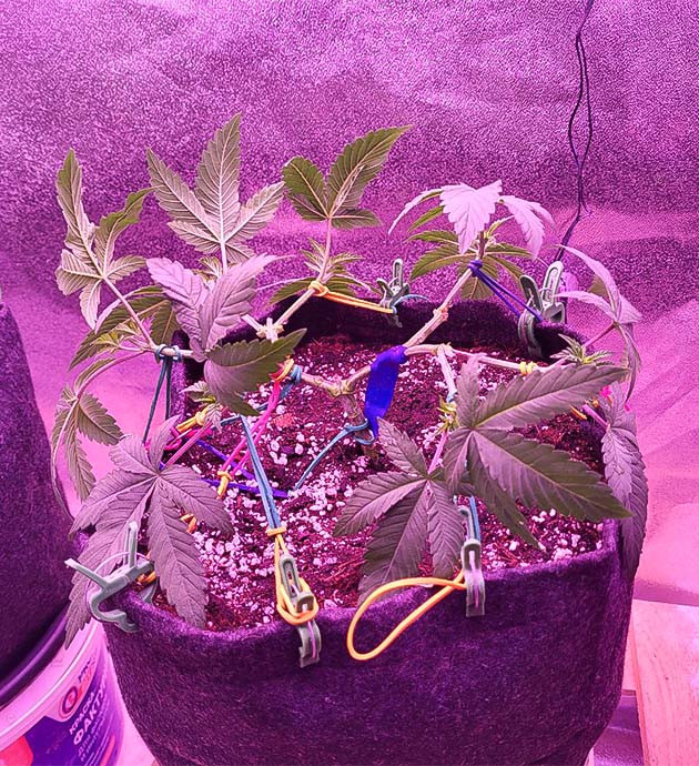 Все места изломов, подломов и трещин растения срослись на отлично, сняли жгуты, а также сняли резинки, заново растянули с помощью хозяйственной верёвки (намного удобнее тянуть растение именно мягкой верёвкой в Propot-горшках). Растяжку произвели таким методом, что будем использовать два кольца по 8 кол, на фото растяжка очень отчётливо видна. Произвели дефолиацию растения, убрали лопухи, обработали растение второй раз трихомайзером по листу. На стрессы практически не реагирует, поведение растения очень достойное.