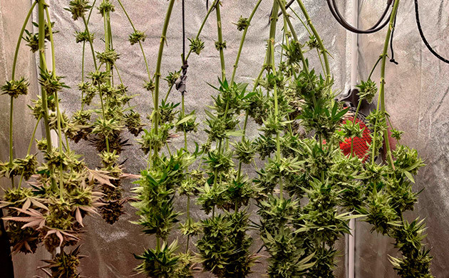 За 2 дня до сбора урожая мы прекратили полив и выключили свет в боксе, а дальше разделили кусты на ветки, убрали с них листья и повесили сушиться.