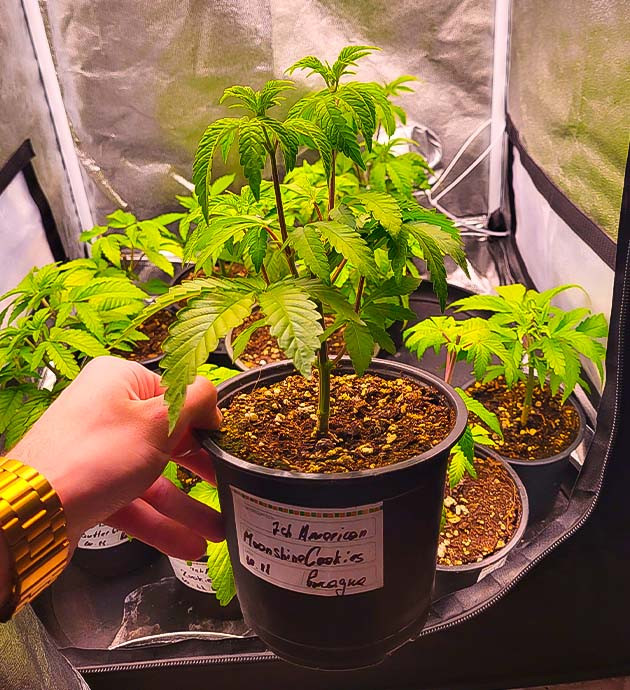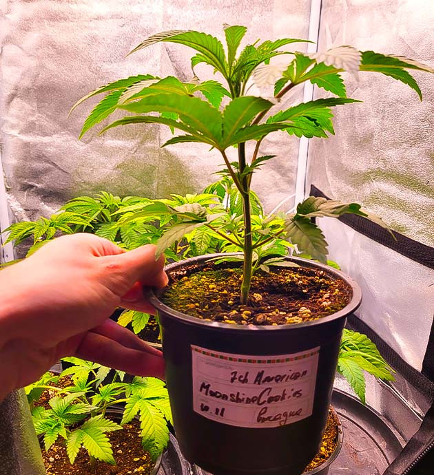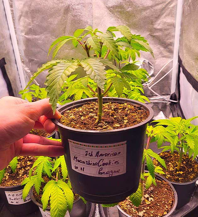 На восьмой неделе жизни растение было переведено на короткий световой день и питательные вещества для стимуляции цветения. Всю неделю наблюдалась хорошая динамика. Moonshine Cookies оказался самым высоким из своих собратьев. Куст имеет жесткий каркас из толстых крепких стеблей. Запаха пока что нет, но если потереть листочки или стебель, то можно почувствовать на пальцах приятный цитрусовый аромат, напоминающий мандариновую мякоть.
