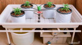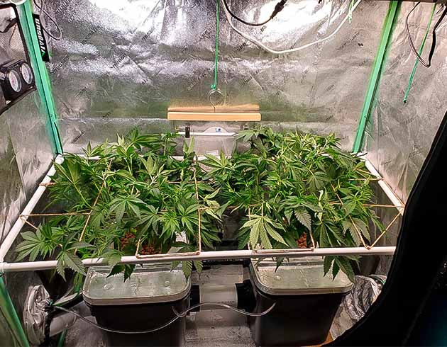Палатка у меня 60 х 120 х 180 см, люстра на 240 ватт (хороший Китай, на брендовый свет просто жалко денег), ведра DWC по 30 литров, соединенные между собой, а контрольный бак-резервуар вынесен за палатку. Удобрения – линейка от Advanced Nutrients.