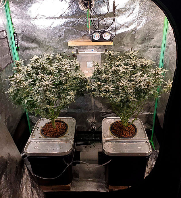 Всю девятую неделю кустики росли на «автопилоте», я уезжал в мини-отпуск и оставил всё на автоматике. Конечно, предварительно проверил исправность всех розеток/подключений, заменил раствор и со спокойной душой уехал отдыхать. По прибытии меня встретили два довольных и абсолютно здоровых куста, которые почти выпили весь бак. Что ж, это радует и означает, что моя работа с растишками почти окончена. Осталось довести дело до логического конца.