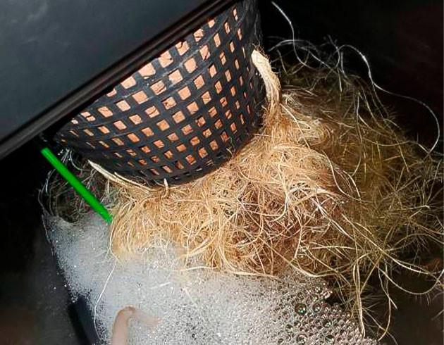 Поставил сетку, расставил имеющиеся макушки по ячейкам, некоторые подогнул. Также поработал с листвой, особенно ниже экрана, удалил много лишнего, отросточки, мелкие отростки, листики. Зачистил всё, чтобы кусты не тратили энергию на то, что всё равно не будет получать достаточное количество света, так еще и мешает нормальной циркуляции воздуха. Сетку натянул на высоте 35 см, а к концу недели высота кустиков по макушкам была плюс-минус 40 сантиметров. Ну и прилагаю фото корневой, оно говорит само за себя.