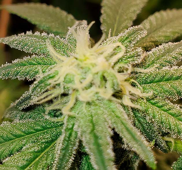 На восьмой неделе установил сетку обратно и провел тщательную дефолиацию. Удалил больше половины листвы, нижние ярусы зачистил особенно хорошо, в какой-то момент мне показалось, что я даже перестарался. Кустик немного приуныл, но быстро пришёл в себя, расправил оставшуюся листву и порадовал меня своими пока еще маленькими, но очень красивыми шишками. На них уже появилась смола, причем очень липкая, как и полагается «Горилле», которая маскируется под именем Apple Betty. Запах после стресса стал заметно сильнее. Его можно описать как свежую смесь характерного конопляного аромата с чем-то фруктово-ягодным. Так пахнет в саду (если убрать коноплю, конечно).