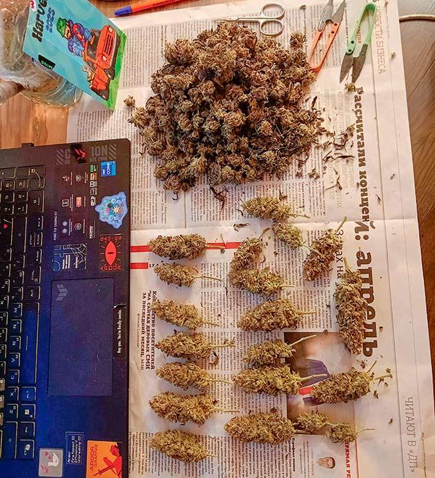 Зеленому повезло больше, там было 40-50% влажности. Сушил 10 дней. Фиолетовому повезло меньше. В тот момент пошли дожди, и влажность была 50 - 60%. Из-за этого весь процесс растянулся на 14 дней.