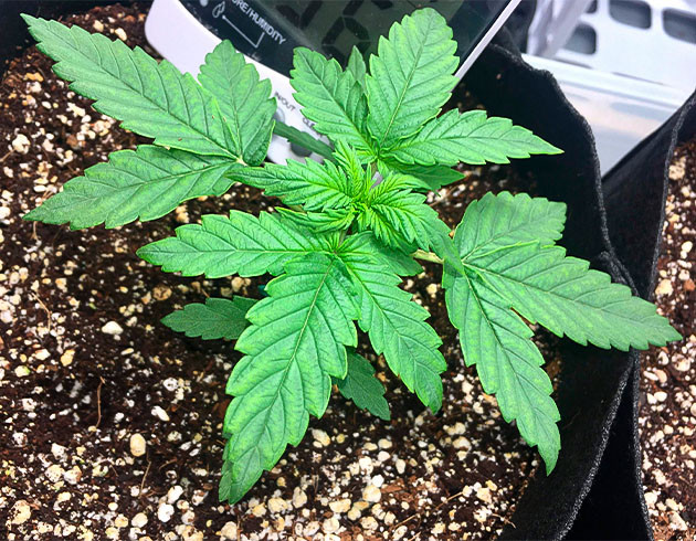 Начал я с того, что взял пять семян и прорастил их по методу Санчеса. Уже к вечеру на второй день между губками меня ждало четыре небольших корешка. Оставил до утра, и за ночь эти корни немного подросли, а на свет проклюнулся пятый. Выглядел он как-то странно, но в любом случае я подготовил пять горшков на одиннадцать литров и пересадил туда проросшие семечки. Грунт взял обычный универсальный из садового магазина и смешал его в равных пропорциях с перлитом. Горшки использую тканевые, так как в них меньше шансов перелить растения, а у меня такое случалось.