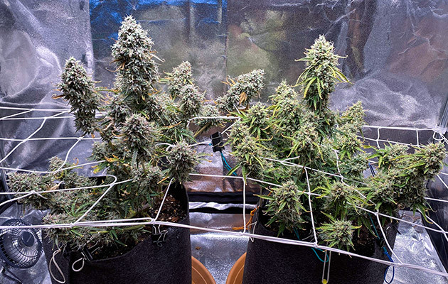 А пока эта девочка начала цвести и стала очень быстро прибавлять в размерах. В сравнении с Glue Gelato она была в 2 раза крупнее и гуще. На 5-й неделе я натянул сетку и стал разводить ветки в разные ячейки. Получилось неплохо, но все равно далеко от идеала. А еще я заметил, что листья на верхушках заслоняют бутончики в глубине куста, и провел дефолиацию первый раз в своей жизни. Что из этого получилось (Wedding Cake Auto слева) видно на фото.