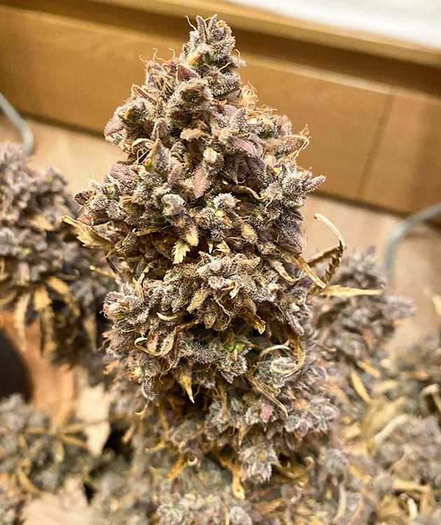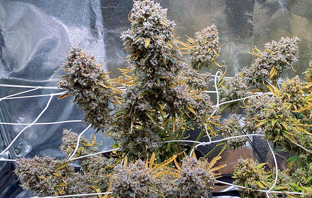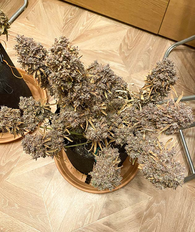Сушил урожай в этом же боксе, подвесив бутоны вверх ногами на сетке ScrOG. При температуре 24 градуса Цельсия и влажности 50 % они провели в таком положении 10 дней. К концу сушки бутоны были очень плотными и сухими на ощупь. К сожалению, я забыл взвесить мокрый урожай, но в общем зачете у меня получилось 230 грамм сухих соцветий, из которых на долю Wedding Cake Auto приходятся солидные 145 грамм.