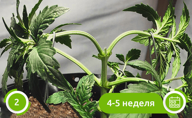 • Второй этап. Через неделю, когда растения продолжат развиваться, можно начать LST-подгиб. Он поможет направить побеги в нужном направлении, что обеспечит равномерное освещение кроны и хорошую вентиляцию куста.