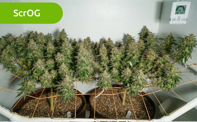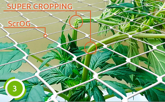 • Третий этап. После восстановления от стресса, примерно через неделю можно выполнить суперкроппинг, чтобы сделать ветви более крепкими и выносливыми для удержания крупных бутонов в будущем, а также натянуть сетку или проволоку над кроной, чтобы помочь ветвям. Если вы в будущем планируете перемещать горшок с каннабисом, то сети ScrOG лучше избегать, ведь после ее монтажа транспортировка не представляется возможной.