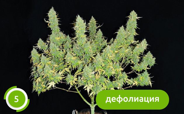 • Пятый этап. Когда крона станет слишком густой, можно прибегнуть к дефолиации. Удаление крупных веерных листьев на этом этапе позволит воздушным массам лучше проходить через крону каннабиса, а значит, и вероятность возникновения плесени и гнили на бутонах сведется к минимуму. При этом свет сможет проходить до самых нижних ярусов куста.