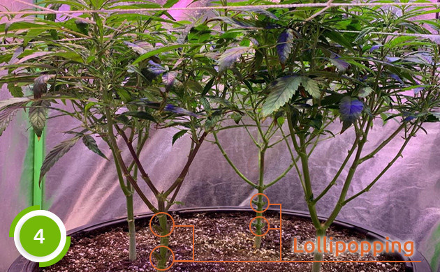 • Четвертый этап. Через неделю после суперкроппинга можно применить технику Lollipopping. Она предусматривает удаление мелких потенциально бесполезных ветвей, которое приведет к более активному развитию верхних крупных соцветий.