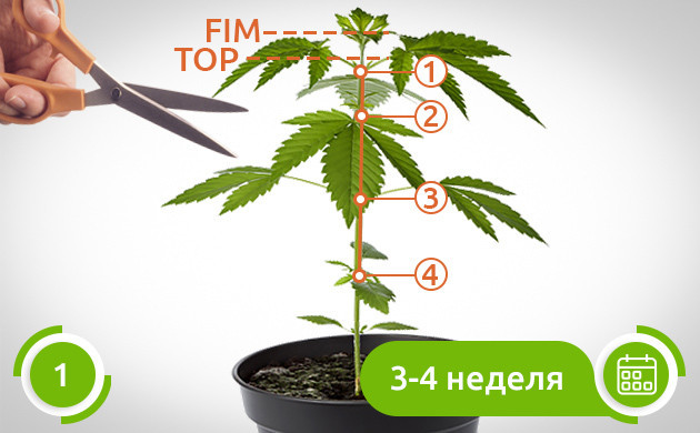 • Первый этап. Обычно это 3-4 неделя, когда на кусте уже сформировано 4 полноценных узла. Начинаем с обрезки верхушки растения по технике топпинг или фимминг. Эта манипуляция приостановит вертикальный рост и простимулирует формирование боковых ветвей.