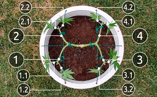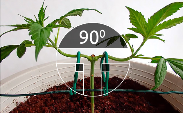 - Из оставленного узла должны исходить два новых боковых стебля. Ваша задача будет зафиксировать их под углом 90° к центральной коле. Подгибать стебли нужно аккуратно и не спеша. Не все сорта каннабиса легко переносят тренировки, какие-то ветви более хрупкие и попросту не перенесут резких движений. Даже если в процессе подгиба стебель надломился, зафиксируйте его в нужном положении, используя скотч или шнурок. Со временем он может прирасти обратно. Чтобы зафиксировать побеги, лучше использовать нетравматичный материал. Это должна быть достаточно толстая проволока в оплетке. Слишком тонкие нитки, лески или проволока могут передавить побег и препятствовать поступлению питательных веществ.