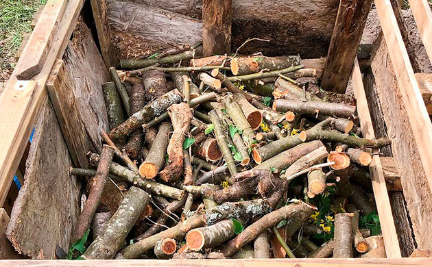 2. Уложите на дно углубления крупные древесные материалы. Начните с базового слоя из веток или стеблей конопли. Этот слой образует основу и будет медленно разрушаться в течение нескольких лет.