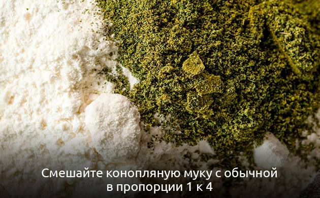 - Смешивайте конопляную муку с обычной. Оптимальная пропорция – 1 к 4, то есть необходимо смешивать 75 % обычной муки с 25 % канна-муки.