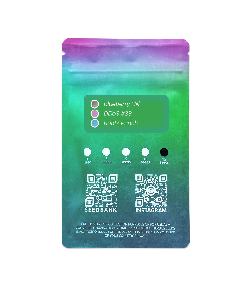 Коллекция феминизированных семян конопли Fem Mix Pack #1 – отличная возможность познакомиться с лучшими сортами от сидбанка Herbies Seeds. Испанская компания включила в этот микс по 5 семян трёх сортов – Blueberry Hill, DDoS #33 и Runtz Punch. Все растения подходят для выращивания как под искусственным светом в индоре, так и в естественных условиях в открытом грунте. Все три сорта являются индико-доминантными гибридами и выведены на основе отборных генетик.