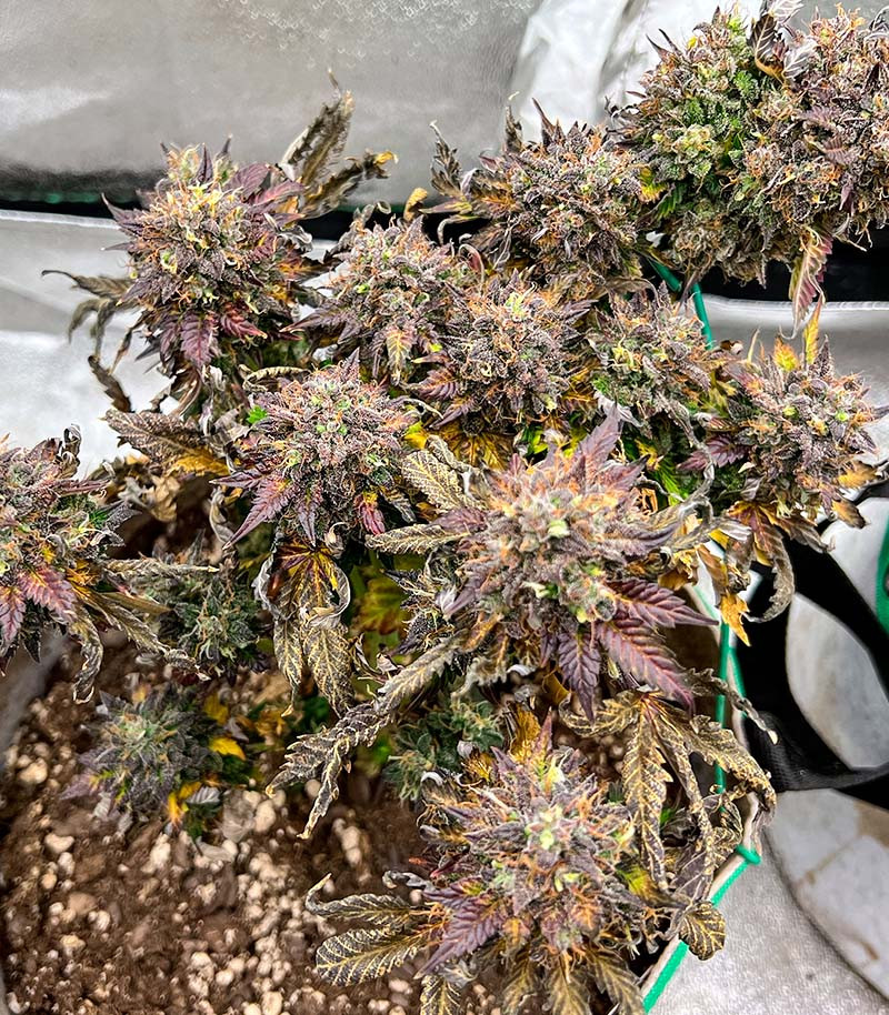 В закрытом грунте растишки GMO не вытягиваются сильно, оставаясь в пределах 100-120 сантиметров. Применяя различные техники тренировок, например топпинг и последующий метод ScrOG или LST, можно сделать кусты еще ниже, но собрать обильный урожай. Цветение сорта достаточно длительное, порядка 75-80 дней. В оптимальных условиях шишки могут созреть и быстрее, но лучше не спешить и дать им достичь своего пика. Урожайность в индоре составляет 550-650 граммов с квадратного метра площади культивации.