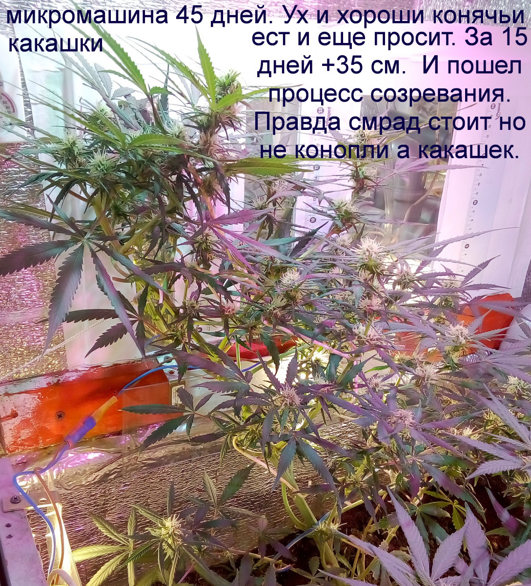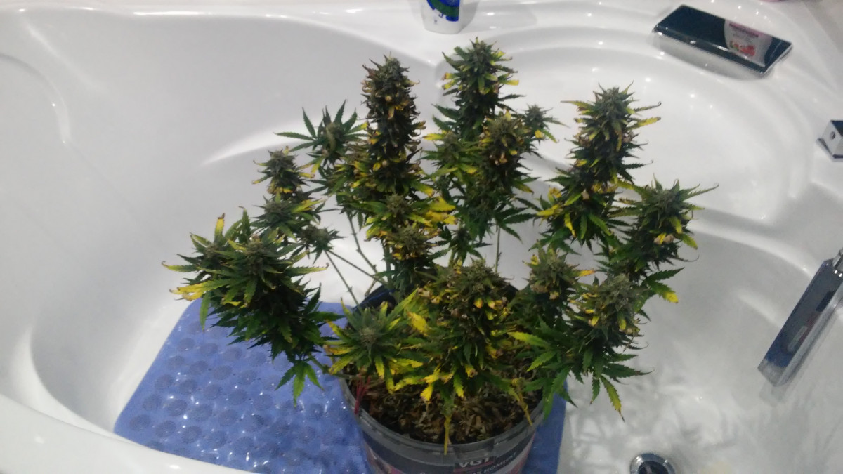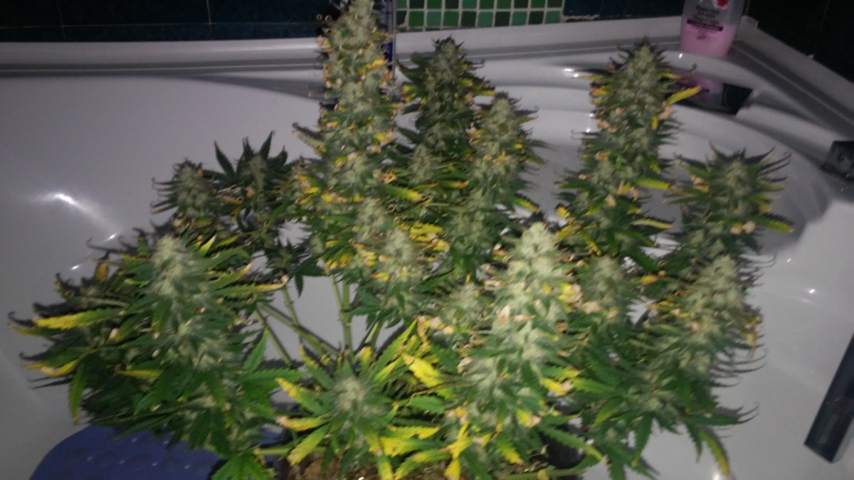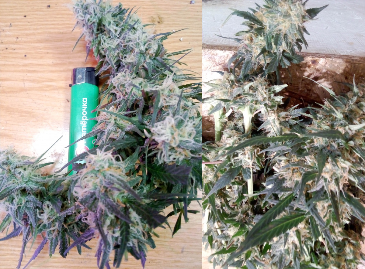 Вырастил один кустик этого сорта. Полный цикл роста занял 5.5 месяцев, но, скорее всего, рост был замедлен за счет разных удобрений и гормонов. Даже когда я собирал урожай, кустик продолжал набирать в росте и массе, но рассмотрение трихом под микроскопом показало, что соцветия созрели полностью. Один куст принёс мне 306 грамм высушенного урожая, только бошки. Общая масса куста со стеблями и листвой составила 1200 грамм.