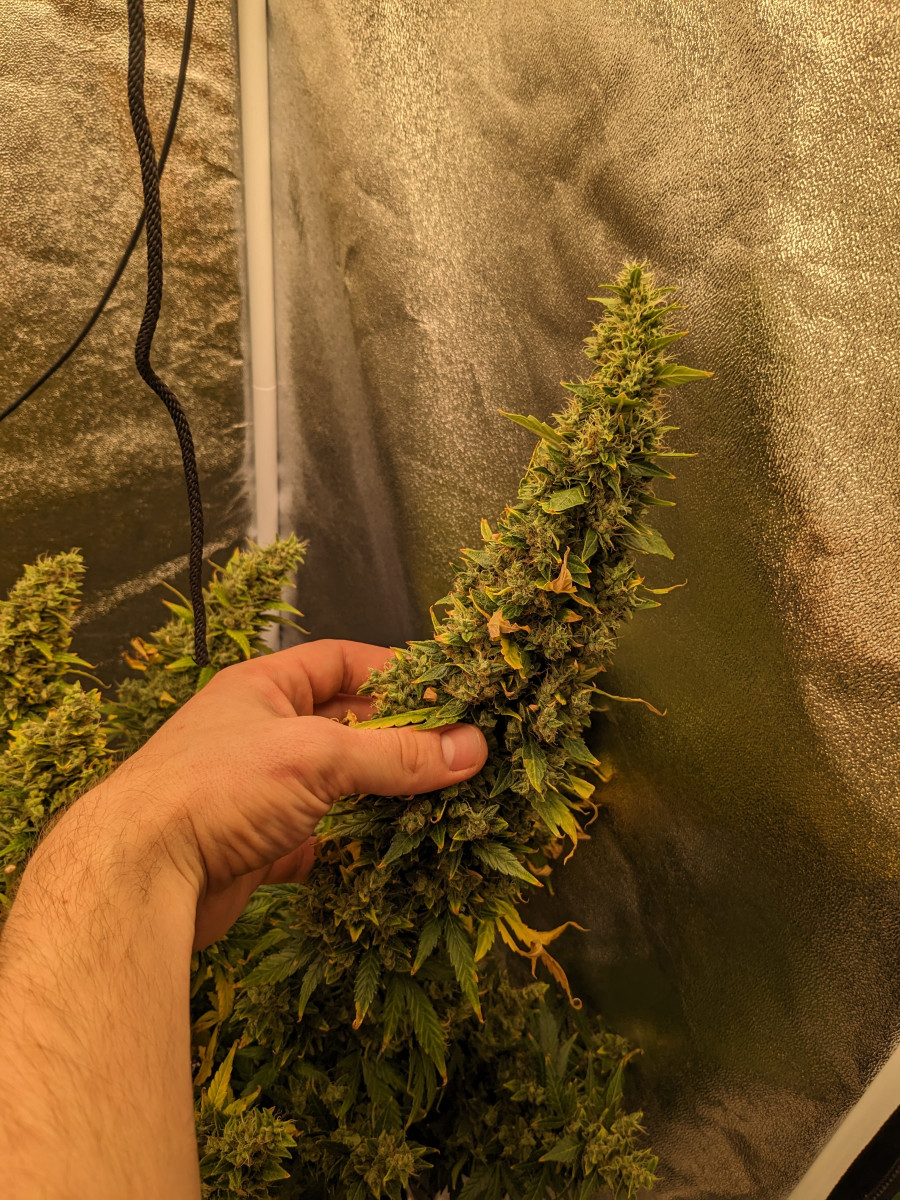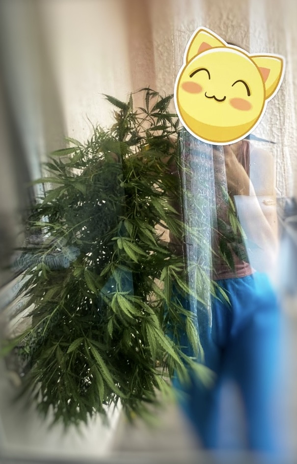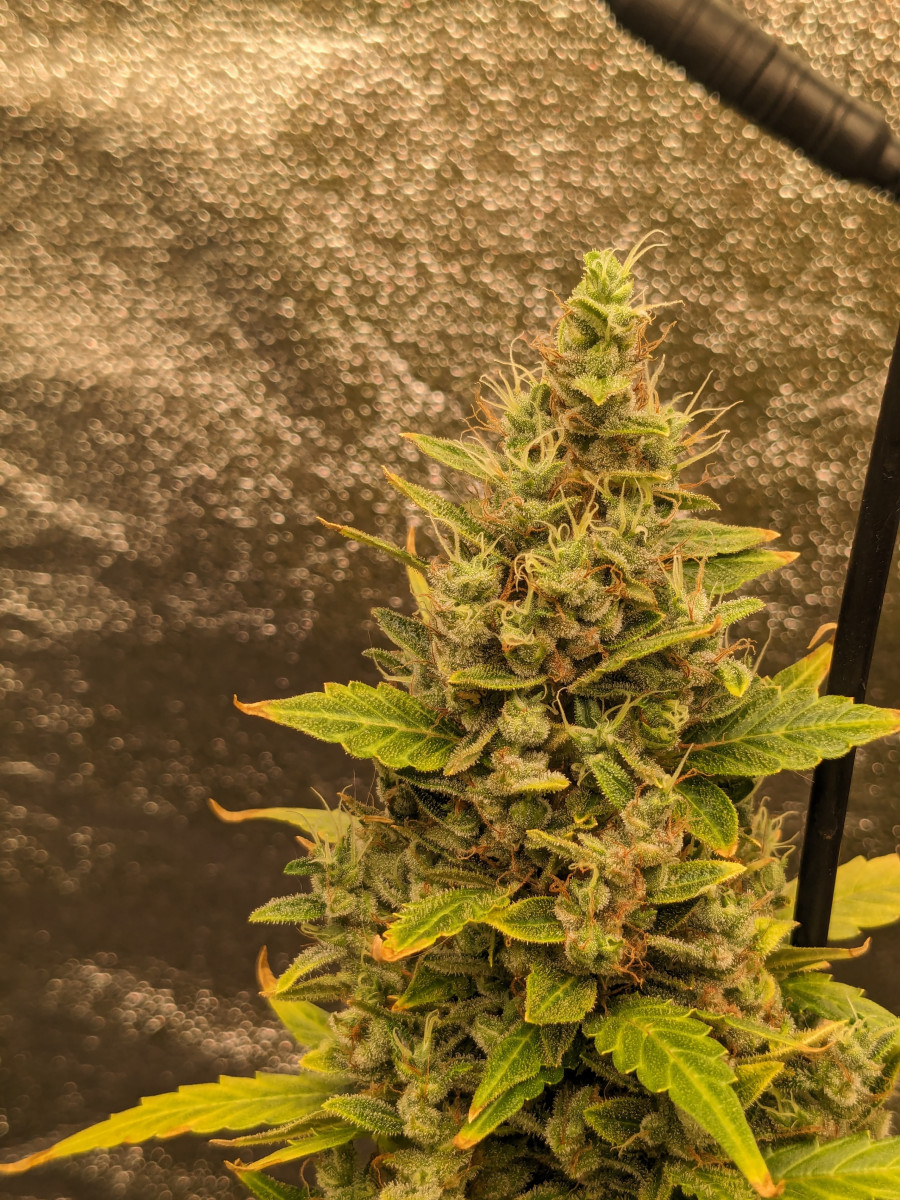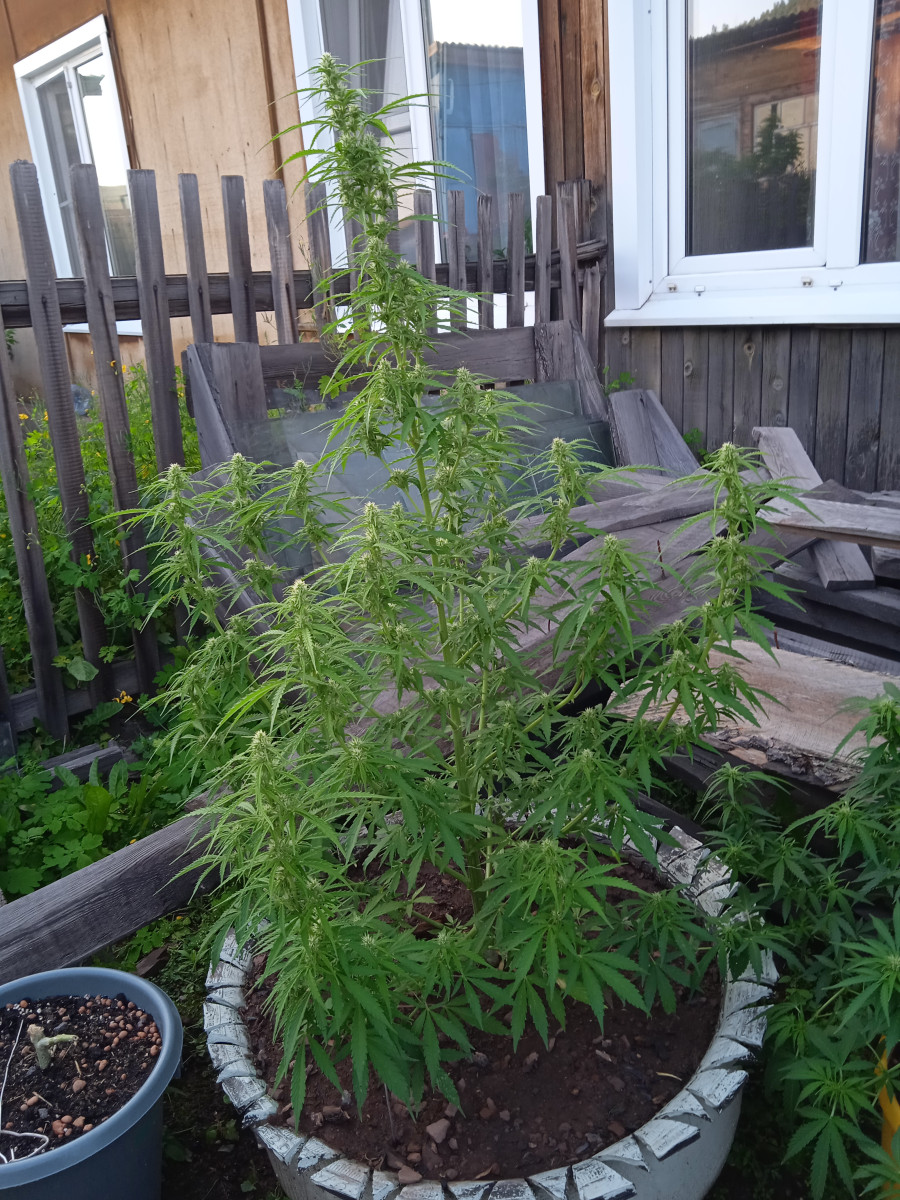 Получился карлик, но это из за бу грунта. Что не мешает быть хорошим шишам. Не воняет. Нет вообще капризных настроений. Поливай и корми и свети. Всё. Запах лимонно-земельный и немного туалетный, да немного пахнет дичкой, которая за сортиром росла.