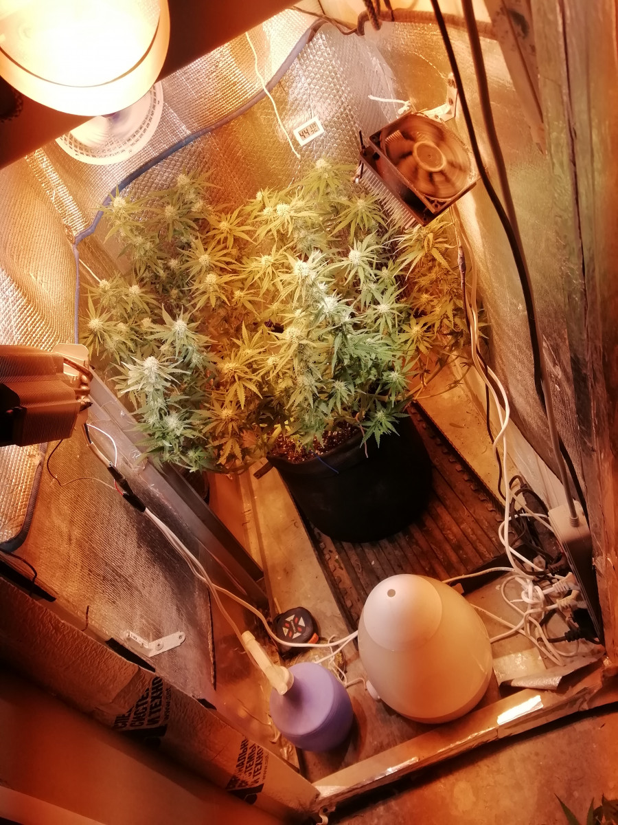 Добавлю что вышло как обещал; зацвёл через неделю после 12/12 весь был в пестиках ,и вдруг кто-то дёрнул ручник- всё повисло не растёт ни цветёт ни хрена,шишки рыхлые трихом мало объём большой а веса нет ,тяга середнячок сативы,как вывод- корни должны расти всё время жизни растений 15 литров для фото ёлки очень мало ,в следующий раз буду умнее ,осталась ещё одна семка-фемка этого чуда .хай.