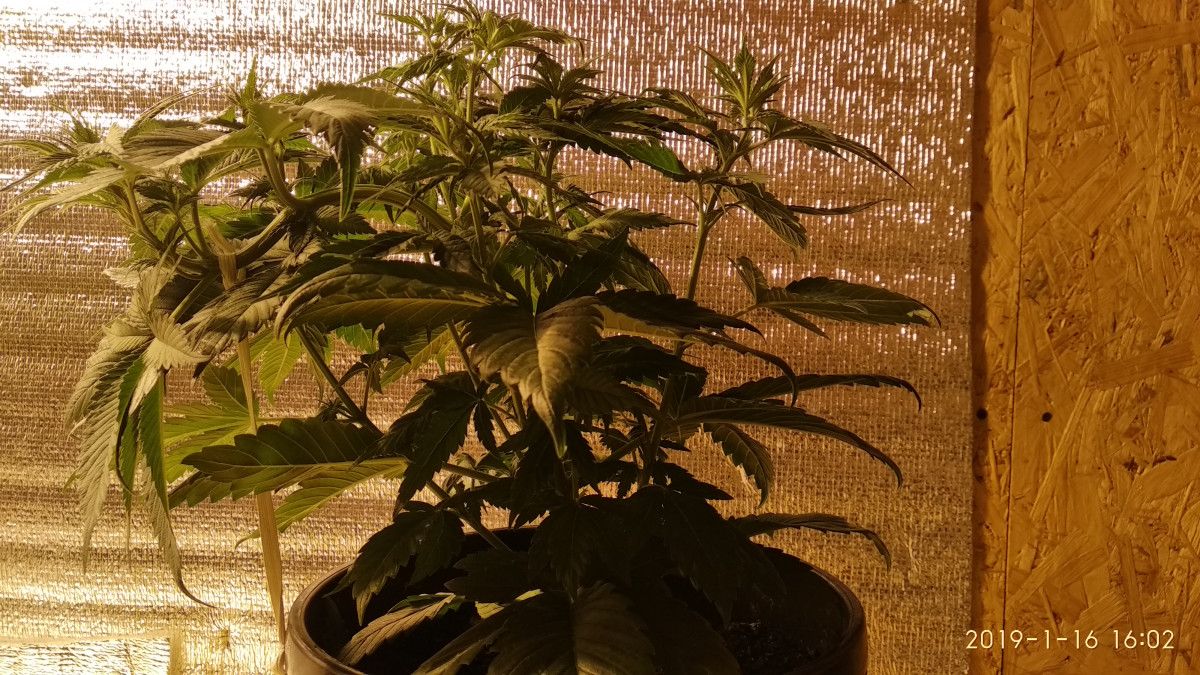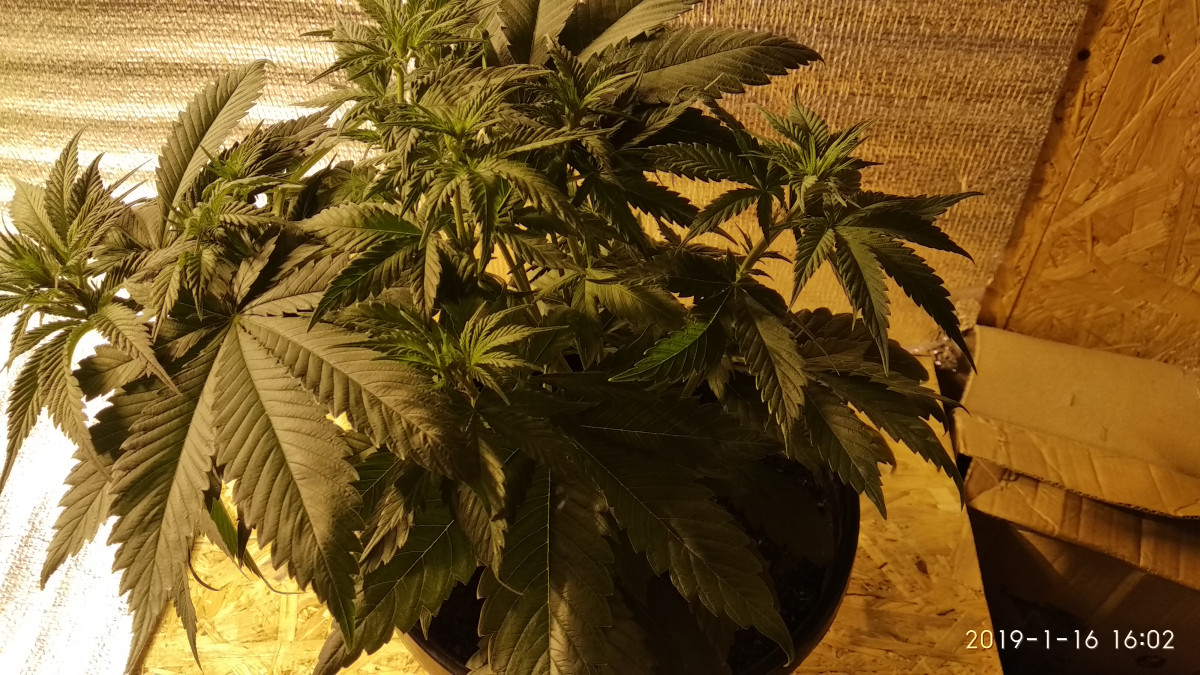 Хорошо начал расти. 3 недели 20 на 4. На фото предцвет - 10 дней, ещё не зацвёл. Центральная кола резко выстрелила в рост, пришлось "тренировать". Общий рост 60 см, Днат 400.