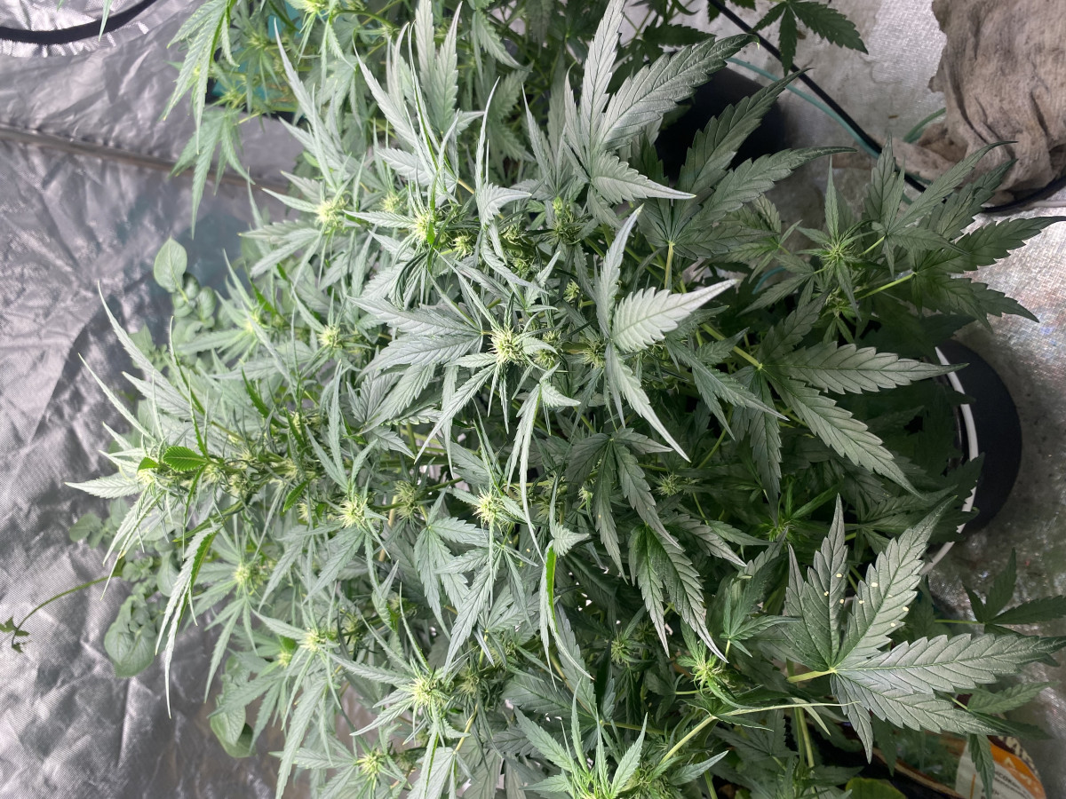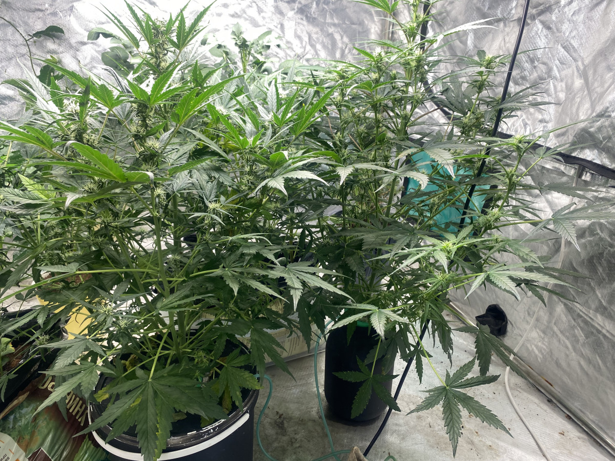Растихам уже 2 месяца, высота около метра, диаметр ствола у земли около 3,5 см)))Правда, пока шишечки маленькие, но думаю недели за две-три нальются еще. Выращиваю в 15 л гроубэгах, чего и всем рекомендую!! Проблем с переливом нет, правда необходимо следить за увлажнением, быстро грунт сохнет. Я поливаю раз в два дня по 1,5л на куст. Выращиваю четыре куста (три Tangie’matic и бонусный АК-47)на 1 кв.метре. На веге-леды 6500К, на цвет-ДНАТ 400W