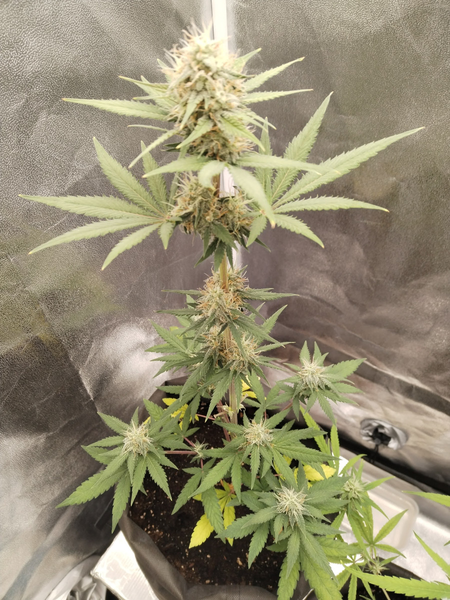 Сажал на улице, досталось ёй от муравьёв, думал не выживет, поднялась, начал гнуть и подвязывать в итоге при хорошем ветре ей оторвало голову, ладно она дама крепкая пережила, в итоге боковые поперли и к осени стоял шарик с 8 основными коллами по 40 см. Красивая зрелая, в итоге 4 3х литровые банки, около 450гр. Сухого, даже жутко прикуренный больше двух не решался, отличная растиха была, хватило на долго, в боксе такого не поднять...