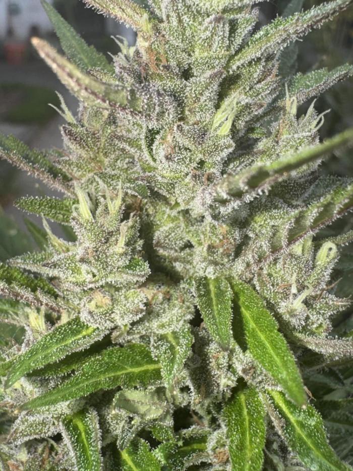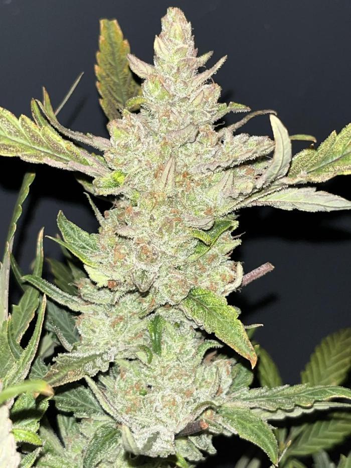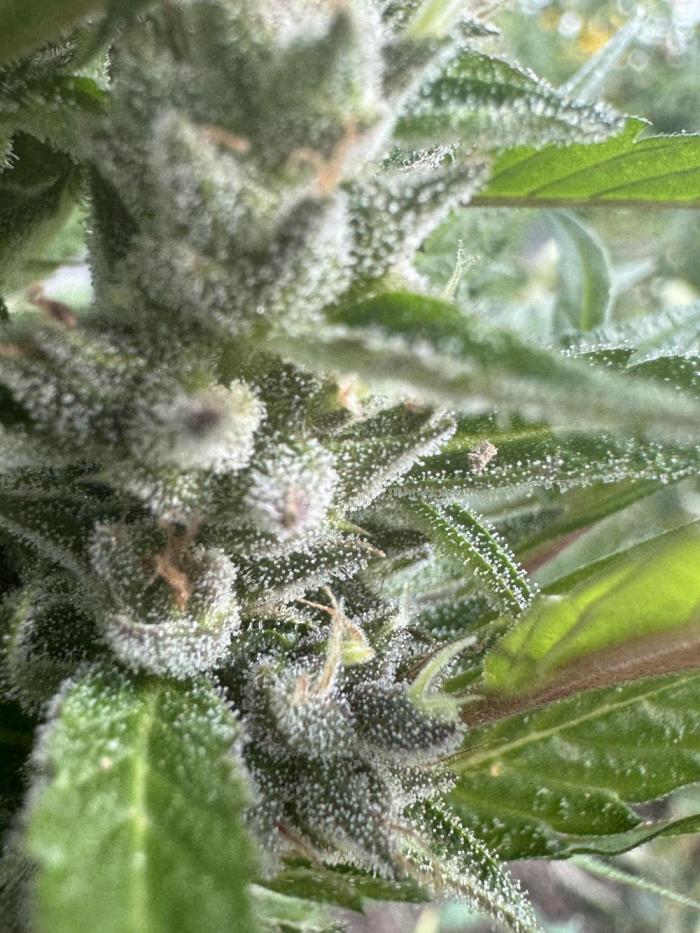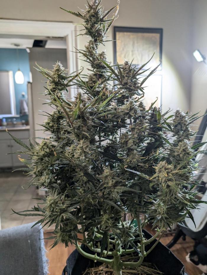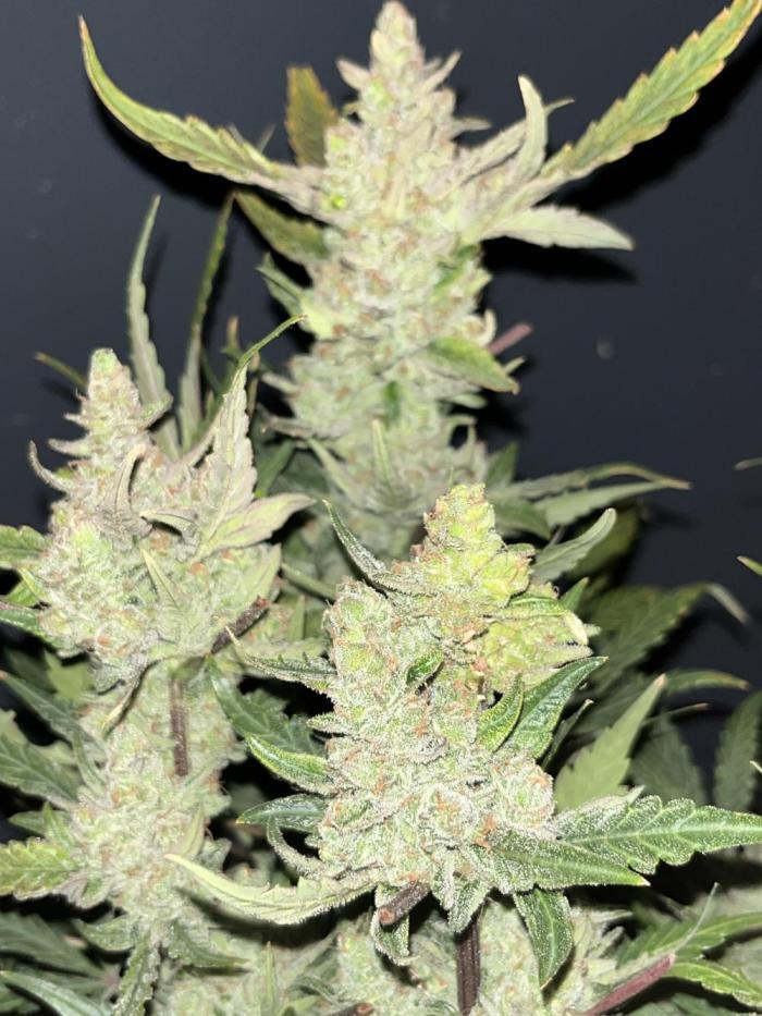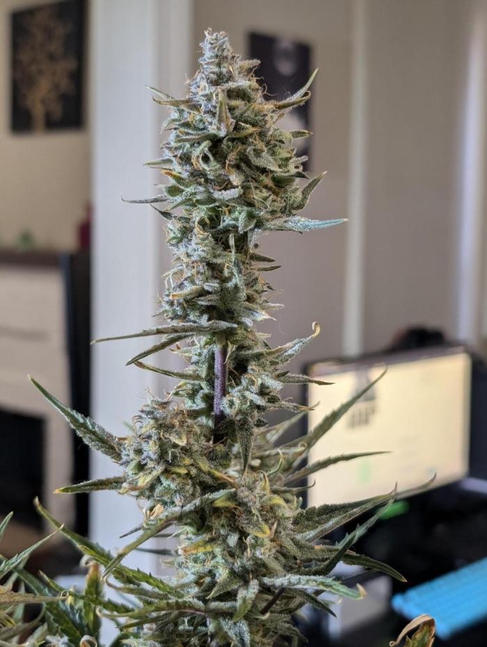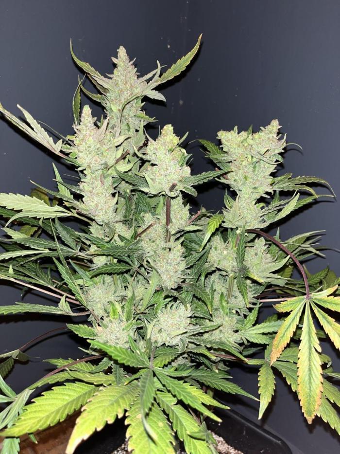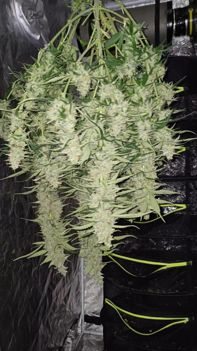 Этот сорт - один из моих абсолютных фаворитов теперь. Он просто взрывается ростом, а потом шишками. Структура симметричная, каждая ветка сплошь покрывается толстыми соцветиями, как верхние ветки, так и нижние. Неземной аромат и колоссальное количество смолы. Она словно снеговик.