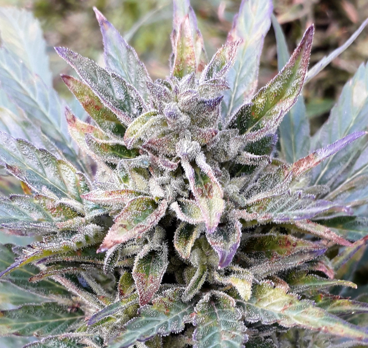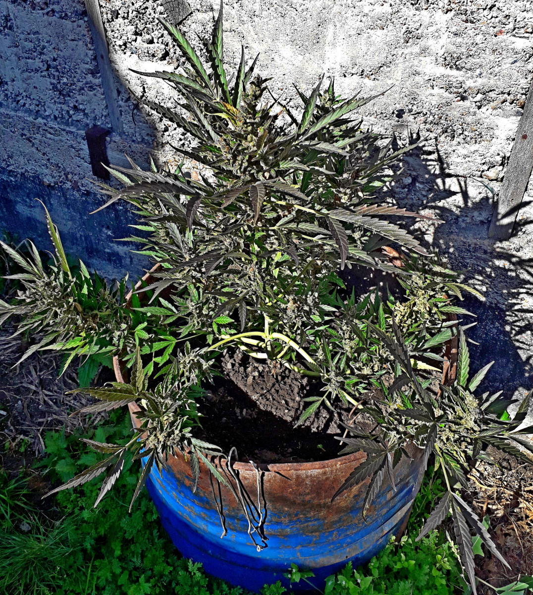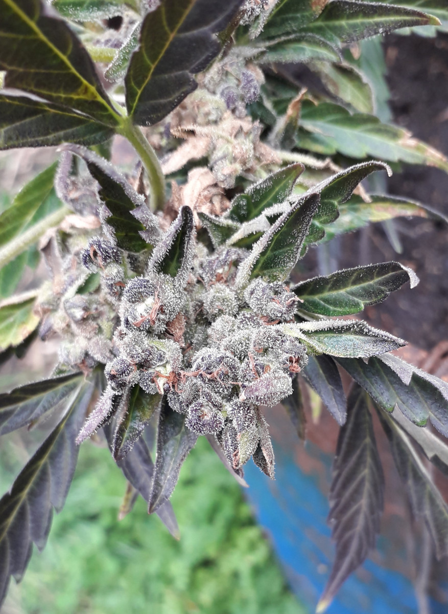 Те гроверы, кто живёт на югах, на 45-47 широте, многие думают, что автики везде быстро растут...но они ошибаются...Конкретно по этому сорту, чтобы полностью вызреть, до конца в ауте, до фиолетовых или пурпурных шишек (в описании не врут про это), на 53 широте потребуется 4,5-5 месяцев...это уже проверено и не раз ( ПИШУ ПРО СРОКИ СОЗРЕВАНИЯ СПЕЦИАЛЬНО ДЛЯ НЕТЕРПЕЛИВЫХ ГРОВЕРОВ АУТА, КТО ЖИВЁТ НА 50-55 широтах, И ЧАСТО, ОБЫЧНО СРЕЗАЮТ И КУРЯТ НЕЗРЕЛЫЕ, НА ПОЛОВИНУ НЕ ВЫЗРЕВШИЕ, ЗЕЛЁНЫЕ ШИШКИ, И СЧИТАЮТ,ЧТО ВСЕ АВТИКИ МАКСИМУМ ВЫРАСТАЮТ ЗА ДВА МЕСЯЦА - ЭТО НЕ ТАК!!!). При плохих погодных условиях и на больших широтах, ни один автик в ауте, даже самый скоростной, никогда не сможет вырасти и вызреть за 2-2.5 месяца, как пишут в описаниях сортов, обычно даже самым скоростным автикам на 50х и выше широтах, потребуется минимум 3 месяца, а большинству автиков придётся расти до полного вызревания 4-5 месяцев - запомните это!!!...И про вес тут в описании, пишут про 700 грамм сырого веса в ауте (и здесь тоже нет вранья), при сушке и маникюре будет выходить 150 до максимум 200 грамм сухих бошек, но это только при хорошем уходе....Кто не верит, про фиолетово-пурпурные бошки в конце созревания, скидываю фотки пурпурных бошек скитлеса и его даже не фиолетовых, а почерневших красиво листьев....Только тут фото ещё маленько не дозревшего автика и шишек, окрас на фото не сильно виден - что пурпурные, но это так и есть, уверяю Вас... Да и размеры автика фотки как-то искажают, вживую он выглядит массивнее (это фотка одного скитлес, самого маленького, ещё два других скитлес, растущих просто на земле, а не в бочке, больше этого в размерах раза в полтора).... ещё две недели "Рипена" и харвест...Всем МИР и БОГАТЫХ УРОЖАЕВ!!!