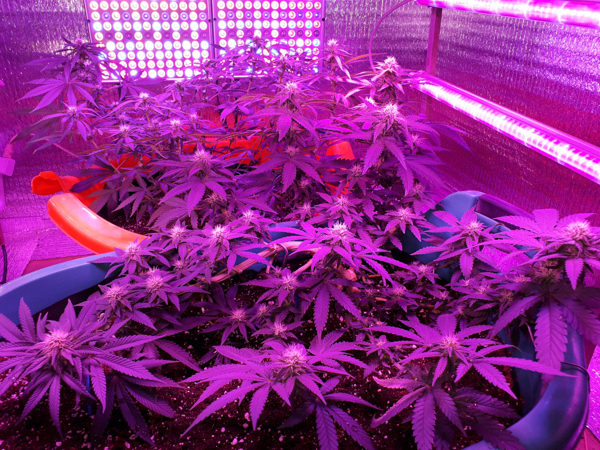 Вот и пролетел предцвет у Супер Лимонного Хэйз (он на переднем плане, на фото), а вот на заднем плане Критический Кали Мист, очень долго растёт, но оно и понятно, там ведь ещё больше сативных генов. Теперь у девочек начинается 2,5 месяца цвета и нарастания, вкуснейших и мощнейших шишуль. Растут кустики на чистом кокосе, если кто думает что на кокосе просто выращивать, то это не совсем так. Для выращивания на чистом кокосе нужны хорошие приборы измерения и хорошие удобрения ну и некоторые познания, тут точно на глазок разводить удобрения не получится. Самым большим преимуществом выращивания кустиков на кокосе перед выращиванием на почве считаю, что в кокосе не заводятся вредители, а это очень сказывается на росте растих, часто в почвосмесях даже в покупных очень много всяких личинок вредителей встречается. Запах от кустиков уже стал проявляться, на пике цветения думаю будет очень мощно попахивать. Советую выращивать эти сорта только терпеливым и толерантным гроверам, это вам не скоростные автики, но впоследствии терпение очень неплохо вознаграждается наслаждением вкуснейшими и мощнейшими шишками. Всем МИР и до встречи в следующих отзывах!!!